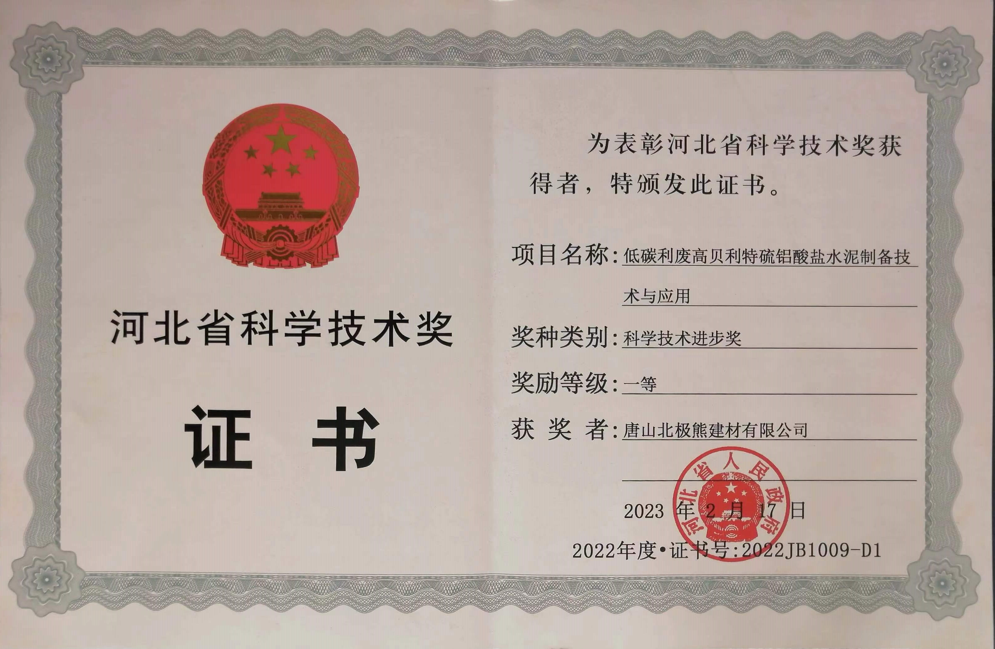 熱烈祝賀我公司低碳利廢高貝利特硫鋁酸鹽水泥制備技術(shù)與應(yīng)用項目,獲得河北省科學(xué)技術(shù)進步一等獎!